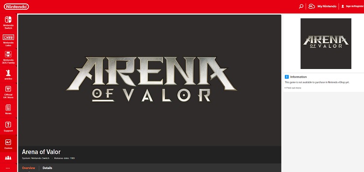 该页面同时提示玩家,AOV Switch版暂时还无法在任天堂在线商店eshop中购买,具体上线时间和评级仍然是“TBD”(To Be Determined,待决定)。