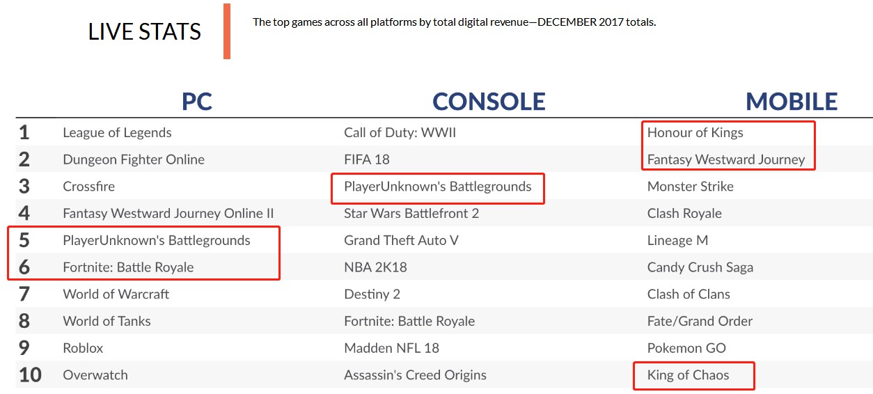 2017年12月主机平台收入榜前十名:《使命召唤:二战》、《FIFA 18》、《绝地求生》、《星球大战前线2》、《GTA V》、《NBA 2K18》、《命运2》、《堡垒之夜:大逃杀》、《Madden NFL 18》和《刺客信条起源》。