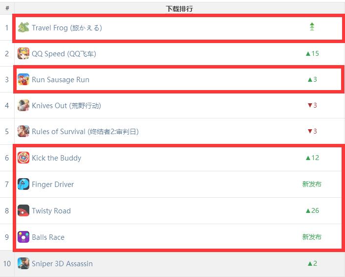此次公布的1月份手游下载榜单中,排入了下载榜前十的6款休闲类游戏分别是《旅行青蛙》(第1名),《Run Sausage Run》(第3名),《Kick the Buddy》(第6名),《Finger Driver》(第7名,《Twisty Road》(第8名)以及《Balls Race》(第9名)。