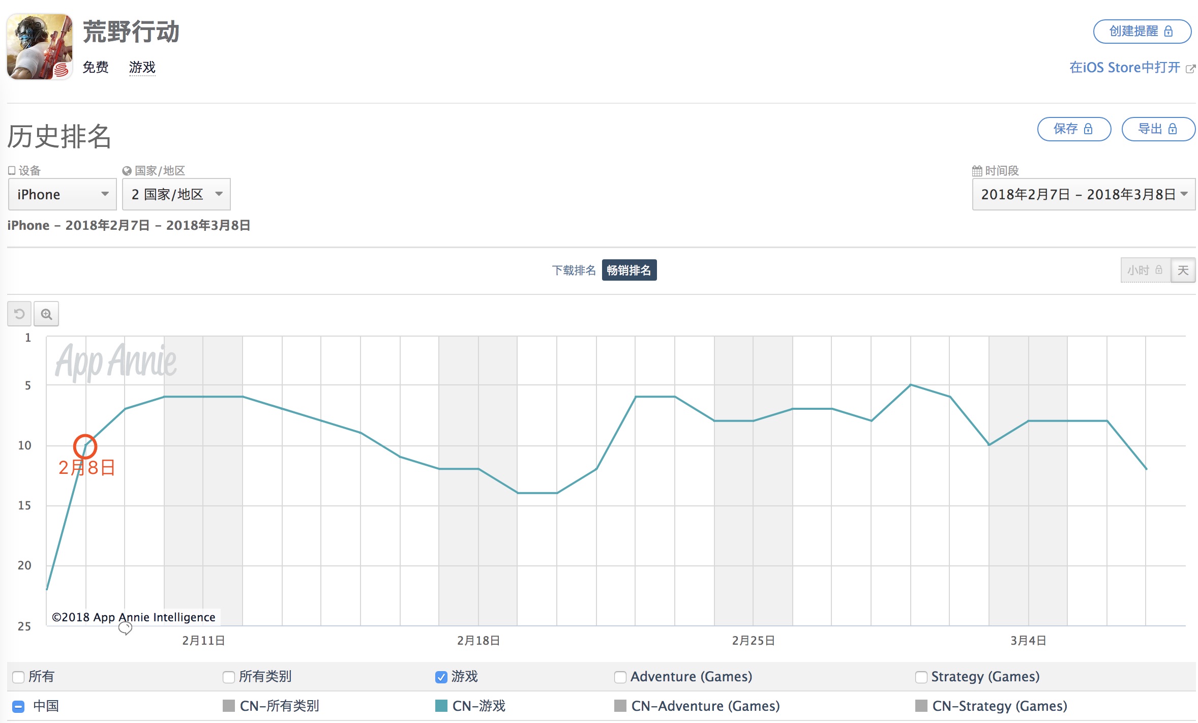 在中国市场,吃鸡手游大战仍在继续,腾讯在2月份推出的两款正版《绝地求生》手游都迅速进入了中国iOS免费版前十,业内公司的统计显示,《绝地求生》手游的dau也已经超过2000万,而且腾讯旗下的另一款射击游戏《穿越火线》也因为加入了吃鸡模式快速增长。