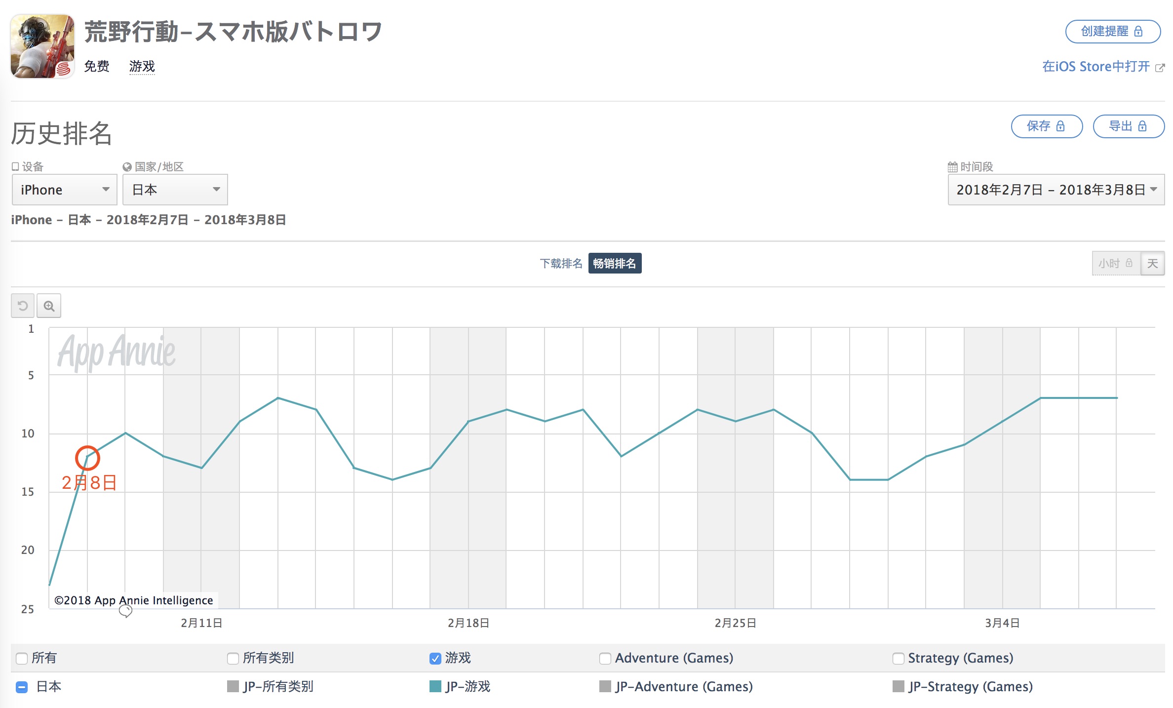 1月份的时候,《荒野行动》海外(英文名Knives Out)全球总收入还只有250万美元,但到了2月份,该游戏海外收入超过了1000万美元,其中80%收入来自日本市场。