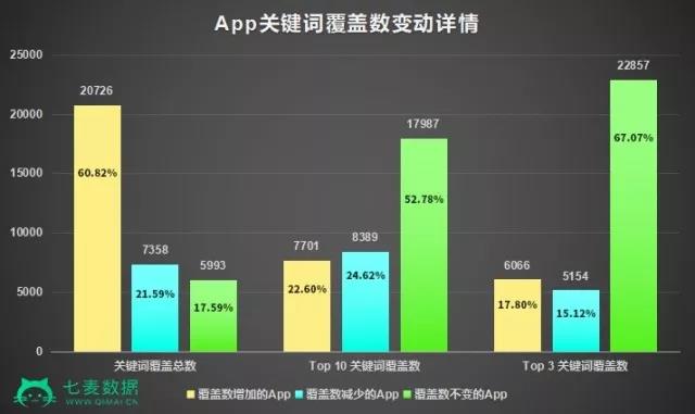 - 七麦研究院曾对 2 月 22 日的所有分类榜 31000 余款 App 作为样本进行对比,发现和 2 月 21 日相比关键词覆盖数变化率占比在 82.41% 以上。其中,关键词覆盖数增加的数量比例达 60.82%,减少比例为 21.59%。