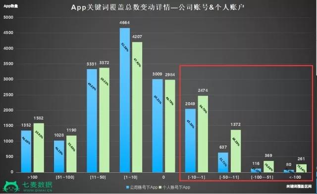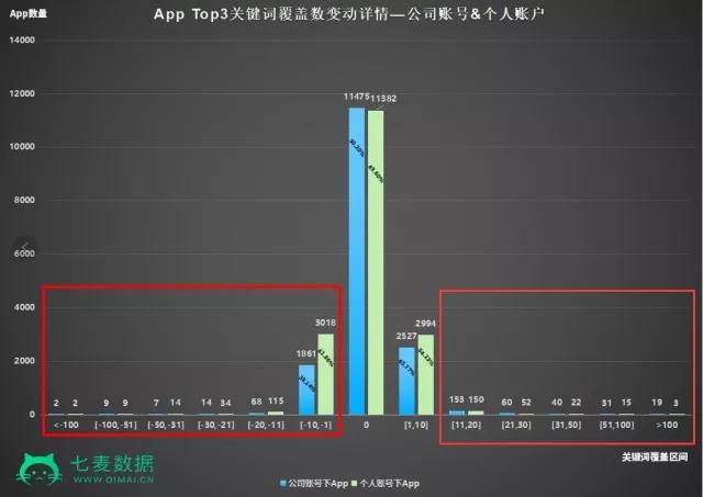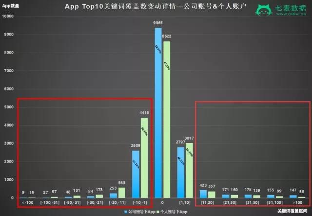 2.从 Top3 和 Top10 关键词总数上来看:如果大家觉得上图对比不太明显,可以看下方 Top3 和 Top10 关键词覆盖总数变动详情图。减少区间(-1 以下)中,个人开发者账号下的 App 数量和公司开发者账号下的 App 数量对比,相差很悬殊。①从 Top3 关键词总数上来看: