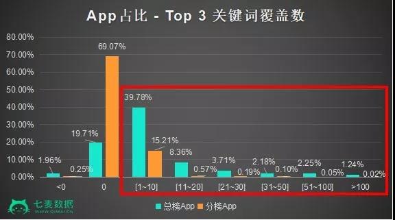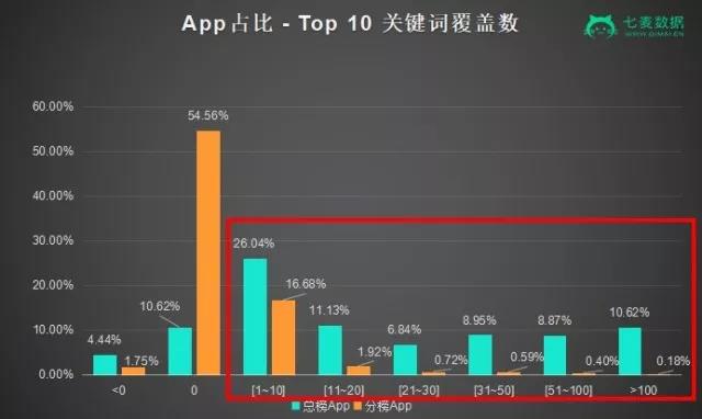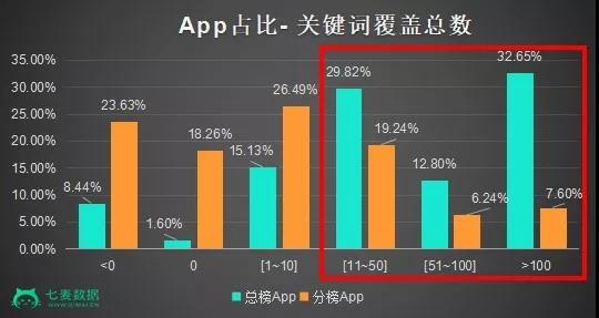 例如:在覆盖总量变化的几个区间中,仅进入分榜的 App 关键词覆盖数降低、不变、少量增加(1~10)的比例更多;而总榜 App 关键词覆盖总量增加超过 10 以上的 App 比例呈逐渐增多趋势。
