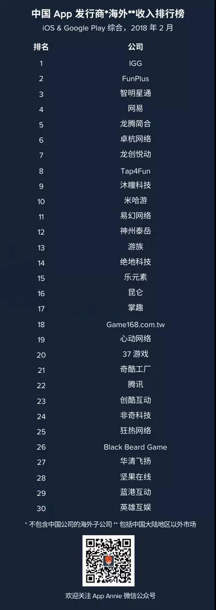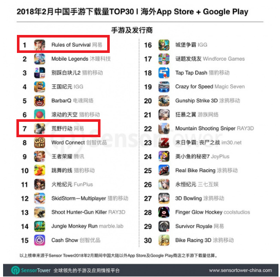 今天(3月30日),App Annie公布了“2018年2月中国App发行商出海收入榜单”。在这份榜单上,老牌游戏出海厂商IGG、FunPlus以及智明星通表现依旧出色,一举拿下了出海iOS和Google Play综合收入榜的前三。此外,得益于两款吃鸡手游——《Knives Out》(《荒野行动》国际版)以及《Rules of Survival》(《终结者 2》兄弟版本)的强劲表现,网易游戏在上个月也交出了很不错的出海成绩单,挤进榜单第4名。不过,腾讯游戏2月的出海表现仍不尽如人意,仅排在第22位。以下是详细的排名: