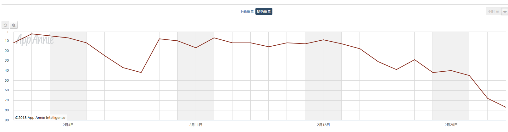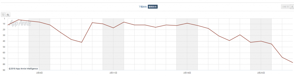 2月《崩坏3rd》在日本市场表现波动较大,APP Store内畅销排名最好成绩达到38名,最差跌出150名。