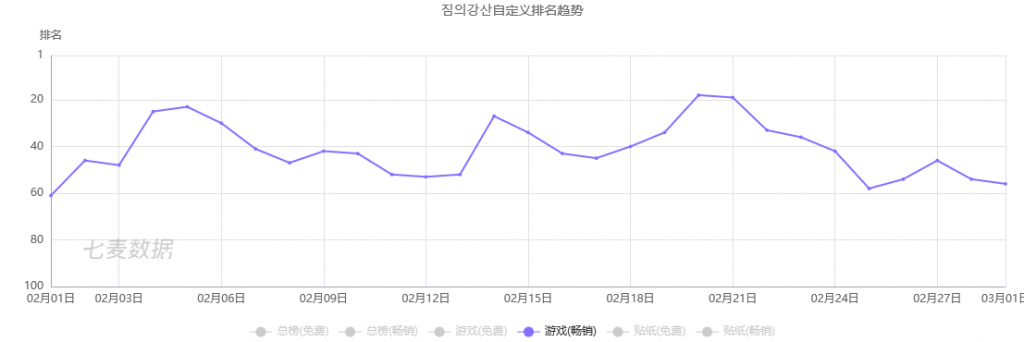 在日本市场,《朕的江山》二月份在App Store游戏畅销榜内40名左右徘徊,最佳成绩达到第25名,但月末有所下降;三月份表现平稳,没有明显波动。