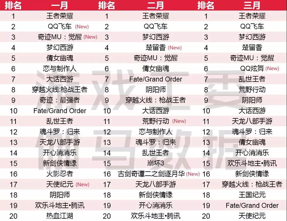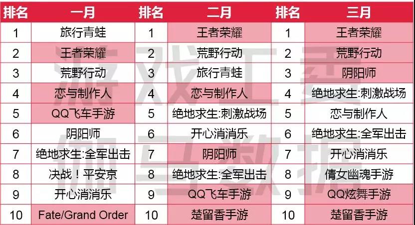 2018年1-3月移动游戏收入榜TOP20