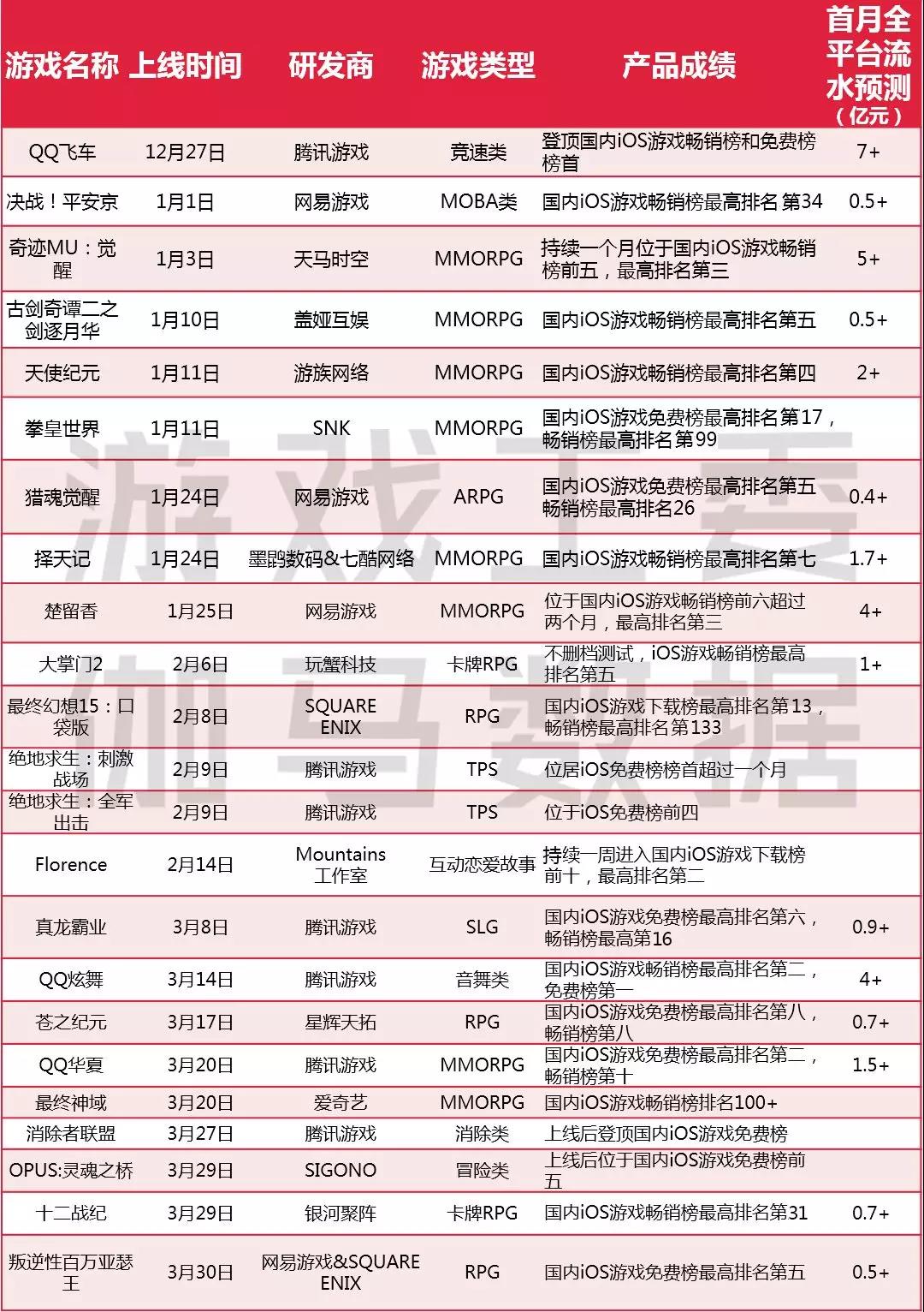 *说明:上述产品为所监测周期内新上线且进入AppStore畅销榜或免费榜TOP100的部分移动游戏,产品成绩监测时间截至3月31日。