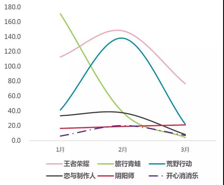 从单款产品来看,《王者荣耀》 《阴阳师》《开心消消乐》 等产品虽然推出时间较长,但由于其自身用户体量大,并且持续深耕微博、微信公众号等粉丝聚焦社区,在热度上依然不减。《荒野行动》《恋与制作人》等新品推出不久,其广告投放、社交媒体营销等推广活动密集,热度保持高位。《旅行青蛙》因为其在社交媒体引起热议与传播,其热度在短时间暴涨,巅峰时期超过《王者荣耀》排名第一。 但由于其产品内容玩法单调,无法保证话题的持续提供,以及用户的稳定运营,热度快速下降。从变化趋势上来看,春节期间也是游戏热度最高的时间段,这与产品市场表现时间曲线存在一定重合。