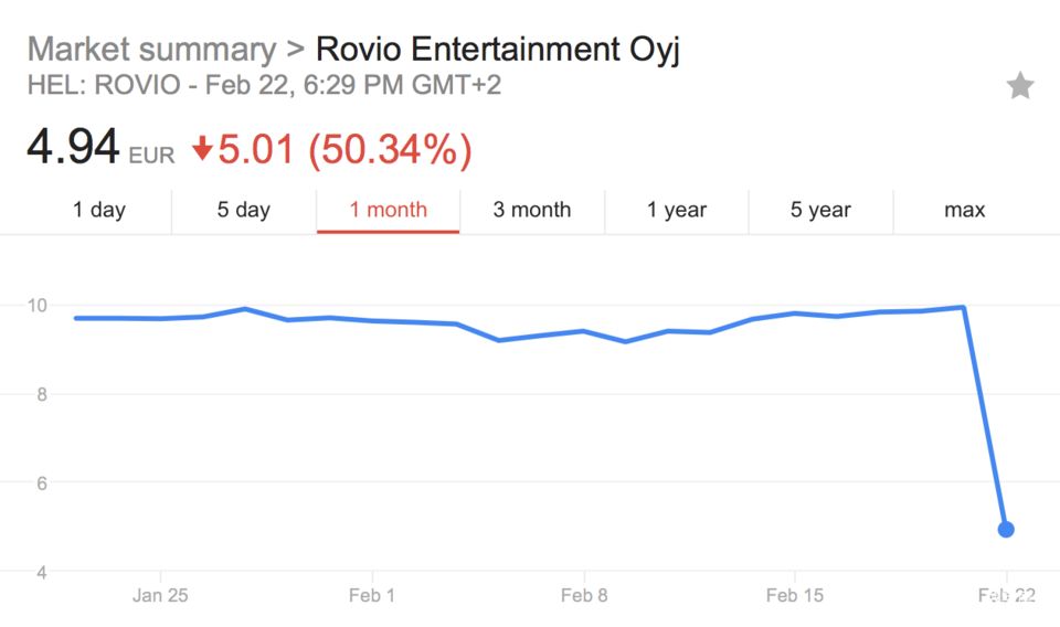 Rovio在2018年2月股价暴跌超50%,随后发布的2017财年财报虽显示净利润同比增长94%,但这并不能阻止投资者对它的失望。表面上Rovio在2017财年的业绩非常不错,收入和利润两项数据分别增长到了2.95亿美元和2000万美元,但跟Rovio在上市前预计的“游戏部门30%运营利润率”相去甚远。