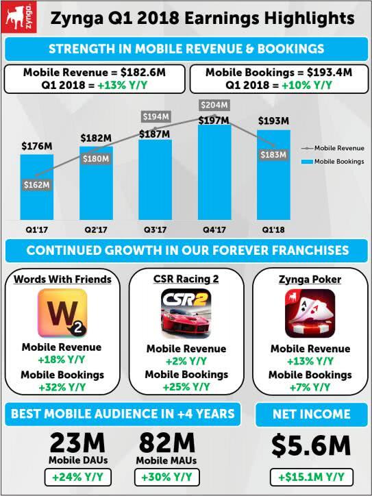Zynga2018财年第一季度收入2.082亿美元,净利润为560万美元,《Zynga扑克》等手游表现强劲,手游收入为1.826亿美元(约合人民币11.6亿),同比增长13%。