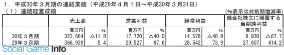 日本SEGA SAMMY HD公司(世嘉飒美)公布了2018年3月期(2017年4月1日至2018年3月31日)通期累计连结财报,整个财年的销售额合计3236亿日元(同比去年同期减少11.8%),营业利润为177亿日元(同比减少40%),经常利润为145亿日元(同比减少48.9%),最终利润为89亿日元(同比减少67.7%),整体呈现减收减益状态。