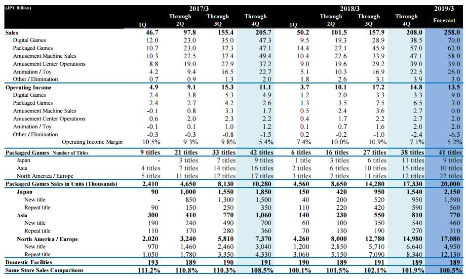 最后,世嘉公司公布了2019年3月通期(2018年4月1日至2019年3月31日)的财报预期,预计全年销售额为3900亿日元(同比去年同期减少20.5%),营业利润为210亿日元(同比增长18.5%),经常利润为160亿日元(同比增长9.7%),最终利润为120亿日元(同比增长34.4%)。
