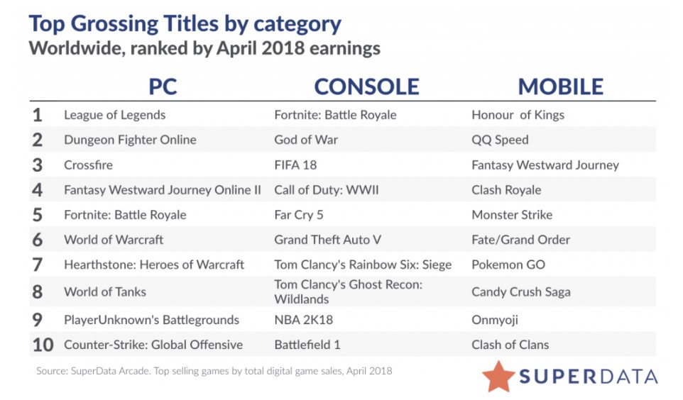 主机平台(数字游戏)4月收入榜Top 10:《堡垒之夜》、《战神》、《FIFA 18》、《使命召唤:二战》、《孤岛危机5》、《GTA V》、《彩虹六号:围攻》、《幽灵行动:荒野》、《NBA 2K18》和《战地1》。