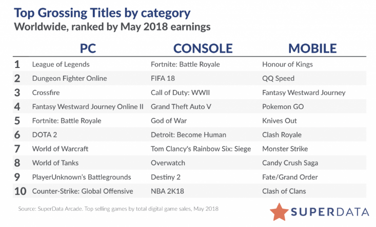 在移动平台,中国出品的手游包揽了榜单前三甲。这3款游戏分别是《王者荣耀》、《QQ飞车手游》以及《梦幻西游》。《精灵宝可梦GO》在5月表现尤其亮眼,营收达到了1.04亿美元,同比增长了174%。这也助推该作成功挤进移动榜单第4名,成为了营收最高的非中国手游。与此同时,这款游戏的单月玩家人数也创下了自2016年高峰期以来的最高值。SuperData指出,这可能与游戏的玩法不无关系——玩家们更喜欢在夏天的户外捕捉小精灵。