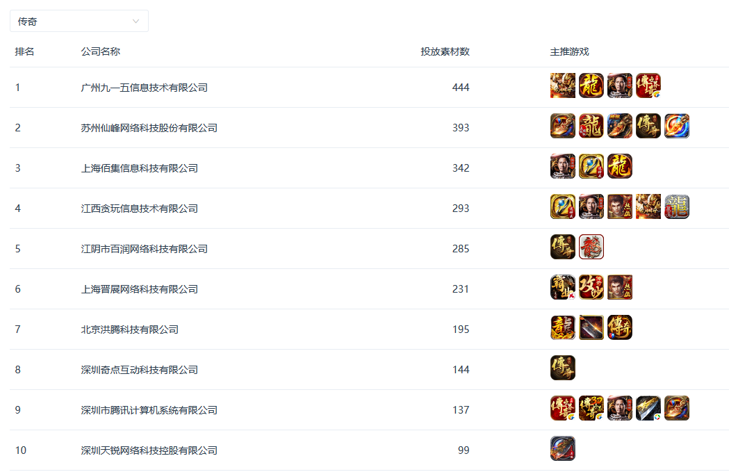 从买量TOP10公司的投放素材数来看,6月份的传奇类产品投放力度和5月相比有略微的提升,TOP10公司的投放素材数在94到407之间,而在上个月是49到388。