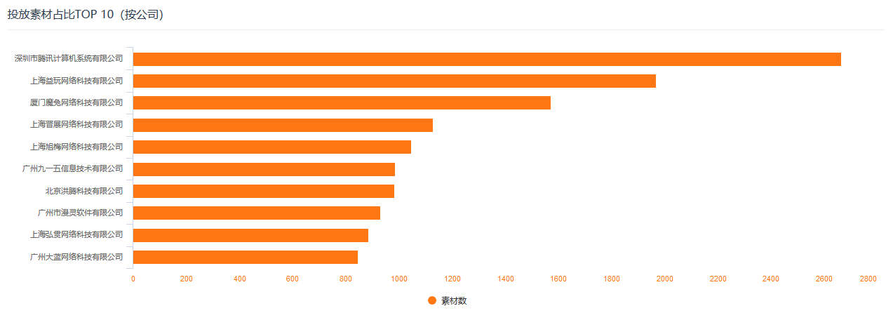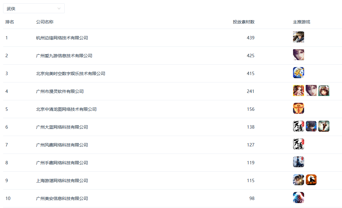 值得注意的是,武侠类TOP3公司的投放素材数和排名往后的公司相比差距较大,TOP3公司的投放素材数都在400以上,而到了TOP4的漫灵,投放素材数骤降近200,而排在TOP10的美安信息科技,投放素材数不足100。此外和传奇、玄幻类相比,买量公司多是主推一款武侠类产品,而较少像传奇、玄幻那样同时联运多款产品。