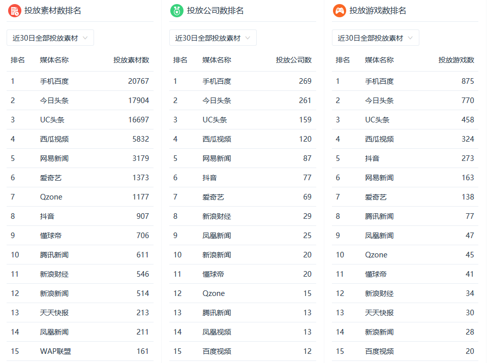 今日头条渠道买量TOP3的游戏产品分别是《开心消消乐》、《龙腾传世》、《神武传世》,网易以731的投放素材数拿下该渠道买量TOP1,其次是九一五和腾讯。