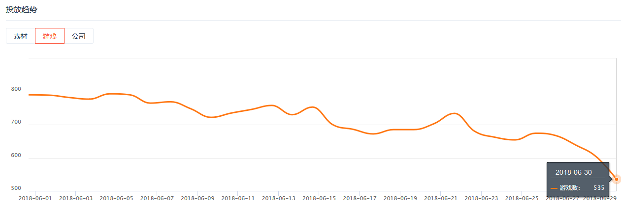 但是到了6月,可以非常明显地看到整个买量市场的规模缩小了,手游买量素材每天的投放量大致在8000到1万2之间上下浮动,在月末甚至跌至6213;每天参与买量的游戏数在600到800之间,单日最高参与买量的游戏数为793,然而5月单日最低参与买量的游戏数就有752;参与买量的游戏公司数量同样是在下滑,每日参与买量的公司在200到300家之间,单日最高参与买量的公司数为312,最低跌至236家。