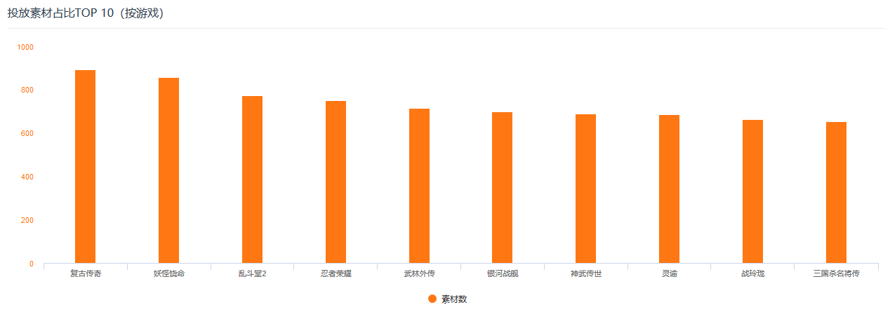 按照投放素材占比划分,6月买量TOP10的产品分别是《复古传奇》、《妖怪饶命》、《乱斗堂2》、《忍者荣耀》、《武林外传》、《银河战舰》、《神武传世》、《灵谕》、《战玲珑》、《三国杀名将传》。6月份TOP10之间的差距已经不大,比如排在第十的《三国杀名将传》的投放素材数为644,和排第一的《复古传奇》仅相差200余组,各款产品投放相差无几,月度投放素材量在650左右就能挤进前十。