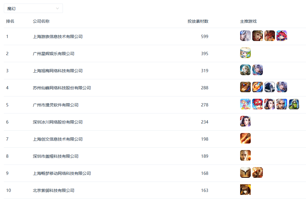 3.魔幻类:游族登上TOP1,投放素材数高达599