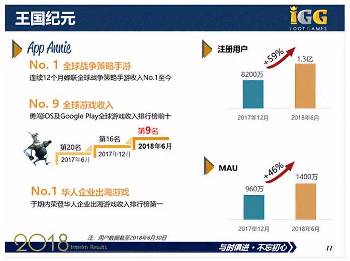 从2017年8月至2018年8月,《王国纪元》蝉联战争战略类游戏收入第一名。2018年6月,《王国纪元》的收入在全球手机游戏排行榜上首次冲至全球第9名。《王国纪元》同时还是华人企业出海游戏第一名。截至2018年6月,《王国纪元》注册用户达到了1.3亿(+59%)相比于2017年12月用户人数8200万,增长了约为5000万人次,每日用户增长约为28万人次。2018年6月《王国纪元》MAU达到了1400万(+46%),相比于2017年12月960万。