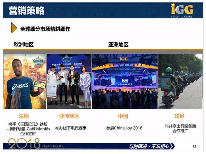 2018年上半年,IGG全球化营销活动深入各地区市场。例如,IGG邀请了法国网球明星Gaël Monfils 合作宣传;在台湾和香港两地各举办了两场对抗赛;在上海参展China Joy 2018;在印尼与共享出行服务商(对比“饿了么”)合作推广,投入了地铁广告和汽车广告。