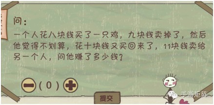 矩叔抓抓头,说道:“这道题简单,1~9瞎蒙总会蒙对。”大家不得不对矩叔的机智,给了32个赞。但矩叔把1~9都蒙了个便都没对!矩叔当即就火了:“强子,你TM整我是吧!给个有BUG的游戏给我玩!”