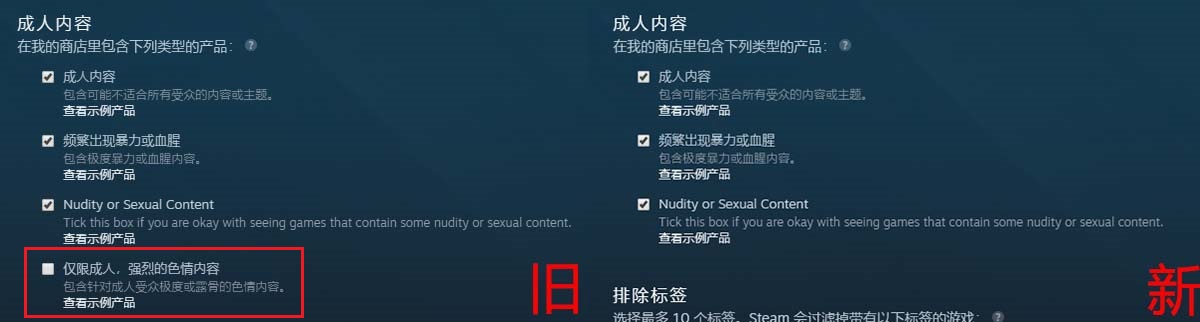 而在最近,有玩家发现,这项专门用来“打开新世界大门”的选项从Steam中消失了,准确地说,是从中国玩家的账户设置里消失了。在变动之前,Steam商店内容偏好设置的成人内容部分,下属一共有4个选项,露骨程度依序提升,第4个也是最过激的选项默认为处于不勾选状态。