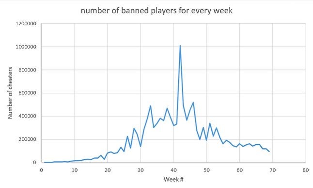 当然,1300万帐号并不等于同样数量的用户,很多作弊者可能会在被封禁之后重新注册其他帐号继续游戏。据了解,被封的原因主要是“使用了未经授权的非法程序”。从数据图来看,《绝地求生》封号数量已经出现明显下降,最近几周甚至每周封号数量低于10万个。