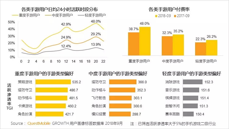 幸运的是,尽管活跃用户不见增长,但Quest Mobile揭示,整体上来看手游用户付费率都有所提升,其中重度、中度和轻度手游用户付费率在9月分别达到48%、35.2%和26.2%。