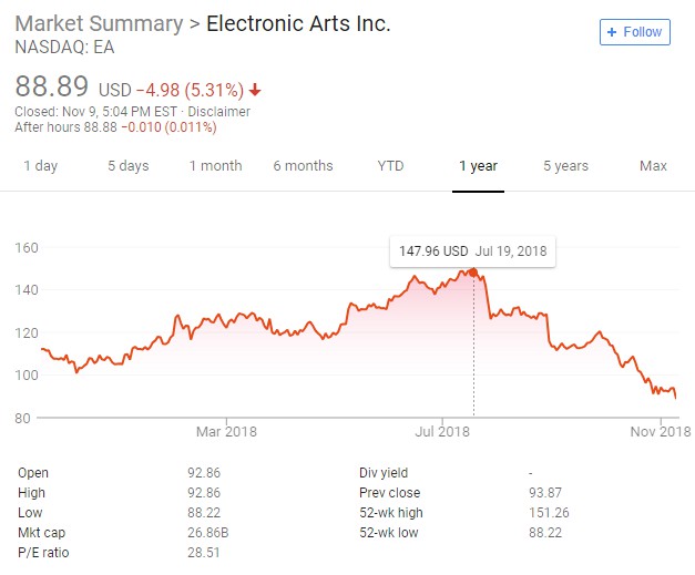本次下跌受到了《战地5》跳票的影响,除此之外,EA主推的在线服务收费模式的增长也开始放缓,主要体现在《FIFA》系列的“终极球队”模式当中,根据此前EA第二季度(结束于9月30日)的财报,EA今年的在线服务收入为3.28亿美元,相比于去年同期仅增长6%。