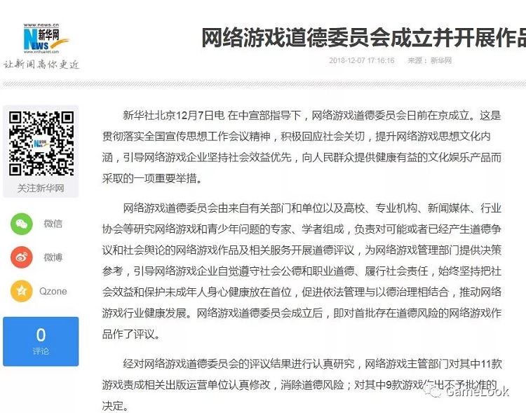 12月7日,央视13套新闻频道《新闻直播间》栏目报道,网络游戏道德委员会在近日成立,并对首批20款存在道德风险的网络游戏进行了评议,最终主管部门对其中11款做出了责成出版运营单位修改,其余9款做出不予批准的决定。