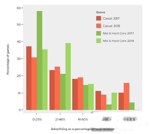 DeltaDNA 表示,在过去的一年里,那些广告占总收入 40% 以上的游戏数量增加了 15%,而在同一时期,广告创造 81%-100% 的总收入的游戏数量则上涨了三分之一(29%)。
