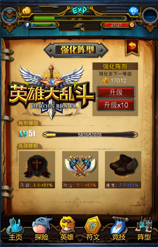 《英雄大乱斗》的阵型系统是游戏的基础系统之一,玩家们可以通过升级阵型来提高战队实力,而阵型的主要属性分为生命、攻击、速度三种,在之前的版本中玩家们只需提高阵型等级,在战斗时选择其中一个属性就可以了,而最新的版本则是把三大属性全部独立,每一个属性阵型都可以独立升级,同时能力也可以兼存,不用再做“三选一”的选择,哪里不行升哪里,妈妈再也不担心你的学习~