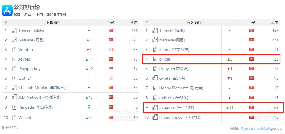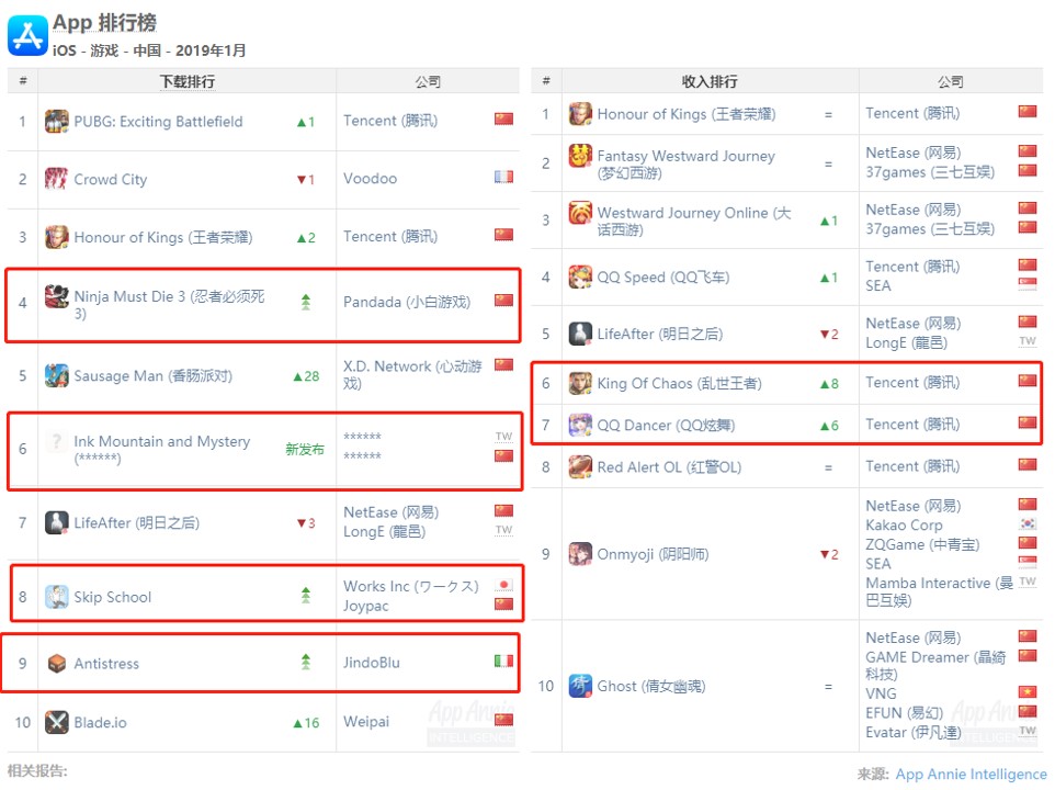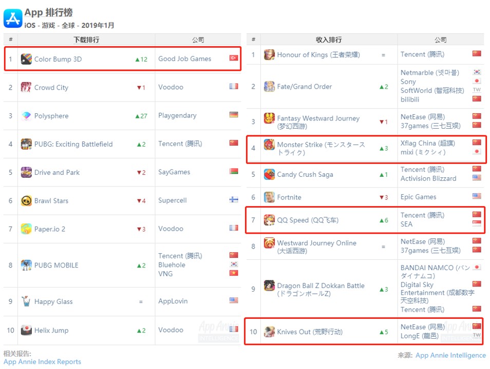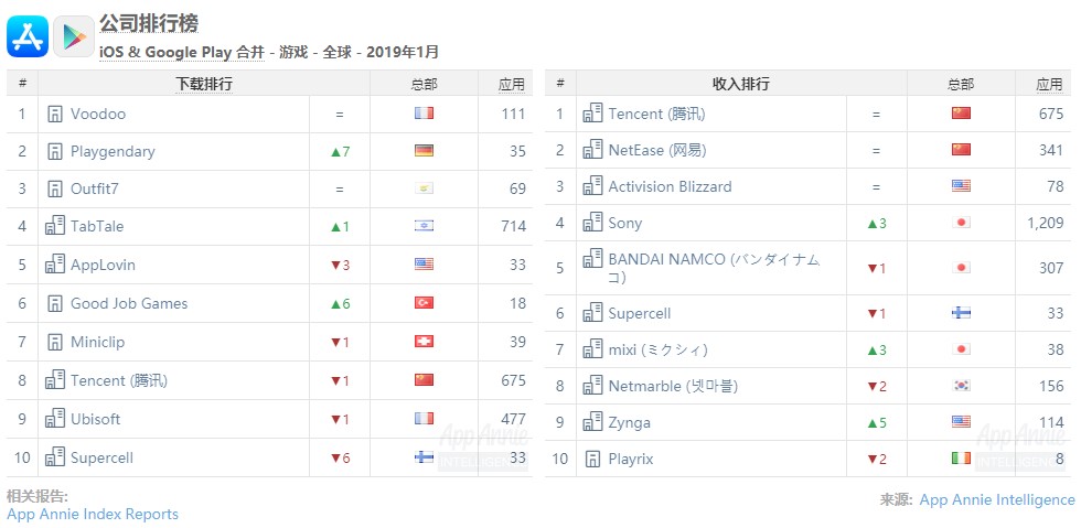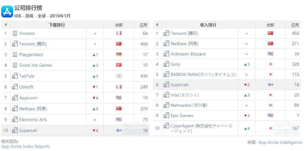 2019年1月全球iOS手游发行商收入榜Top 10:腾讯、网易、动视暴雪、索尼、万代南梦宫、Supercell、mixi、网石、Epic Games和CyberAgent。