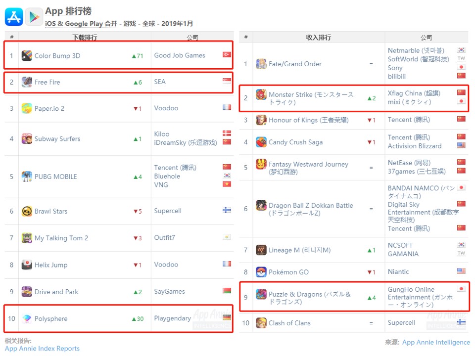 Appannie近日发布的2019年1月全球手游报告显示,国产手游在全球综合收入榜的排名持续走低,《王者荣耀》虽然仍然保持了iOS全球收入冠军,但在综合收入榜已经降至第三位,被《F/GO》和《怪物弹珠》超越。小游戏仍是免费榜的主力军,其次则是以《绝地求生》和《Free Fire》为代表的吃鸡手游。