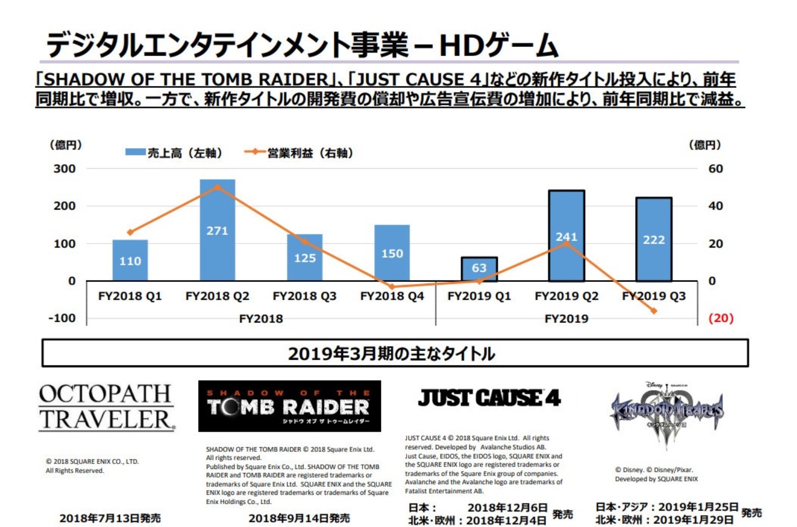 SQUARE ENIX昨日公布了2019财年第三季度(2018.10.1-2018.12.31)财报。该季度SE营收和利润相比去年同期都出现了下滑,主机游戏业务更是亏损了17亿日元。