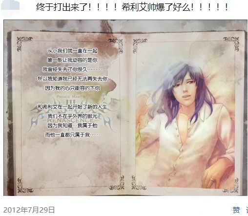 2012年二周目攻略了西蒙(希利艾)时自己发布的欢呼动态