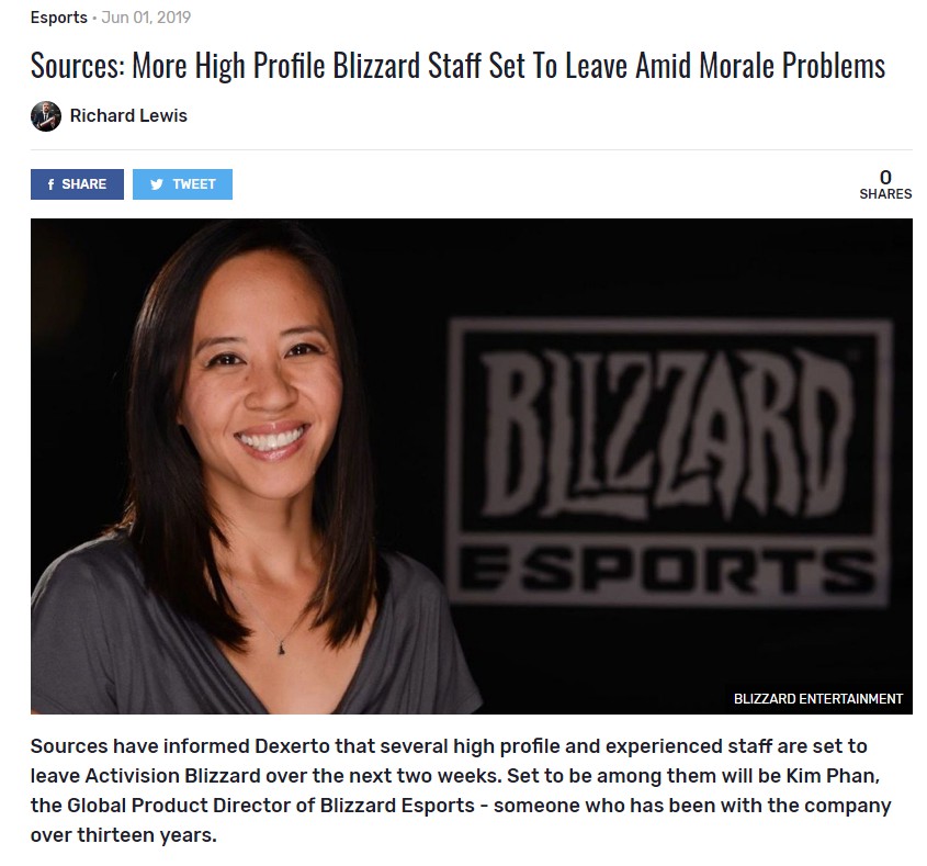 近日,外媒Dexerto发布报道称,在接下来的两周时间内,将会有更多的资深暴雪员工离开动视暴雪,其中甚至还包括了暴雪全球电竞总监Kim Phan,她已经在暴雪工作了十三年之久。此前离职的还有《守望先锋》联赛主席Nate Nanzer。