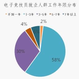 对电子竞技员就业人群从业年限情况进行调研,通过数据整理可以看出,其中有58%被调查的电竞从业人员工作年限在1-3年之间,30%的电竞从业人员工作年限是3-5年,这两项占据了被调查者总数量的88%,另外有7%的从业人员工作7年以上,4%的从业人员工作5-7年,2%的从业人员工作不到1年。根据调研结果可见,电竞行业从业者的工作年限都相对较短,这与整个电竞行业发展周期较短有必然联系。