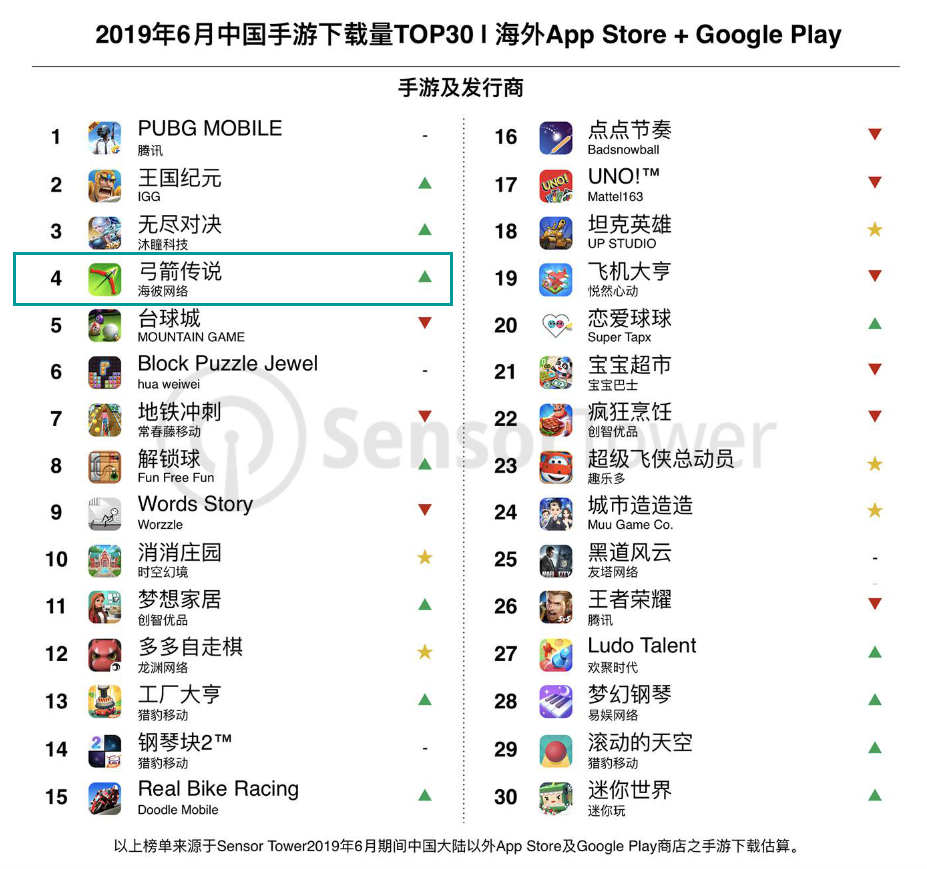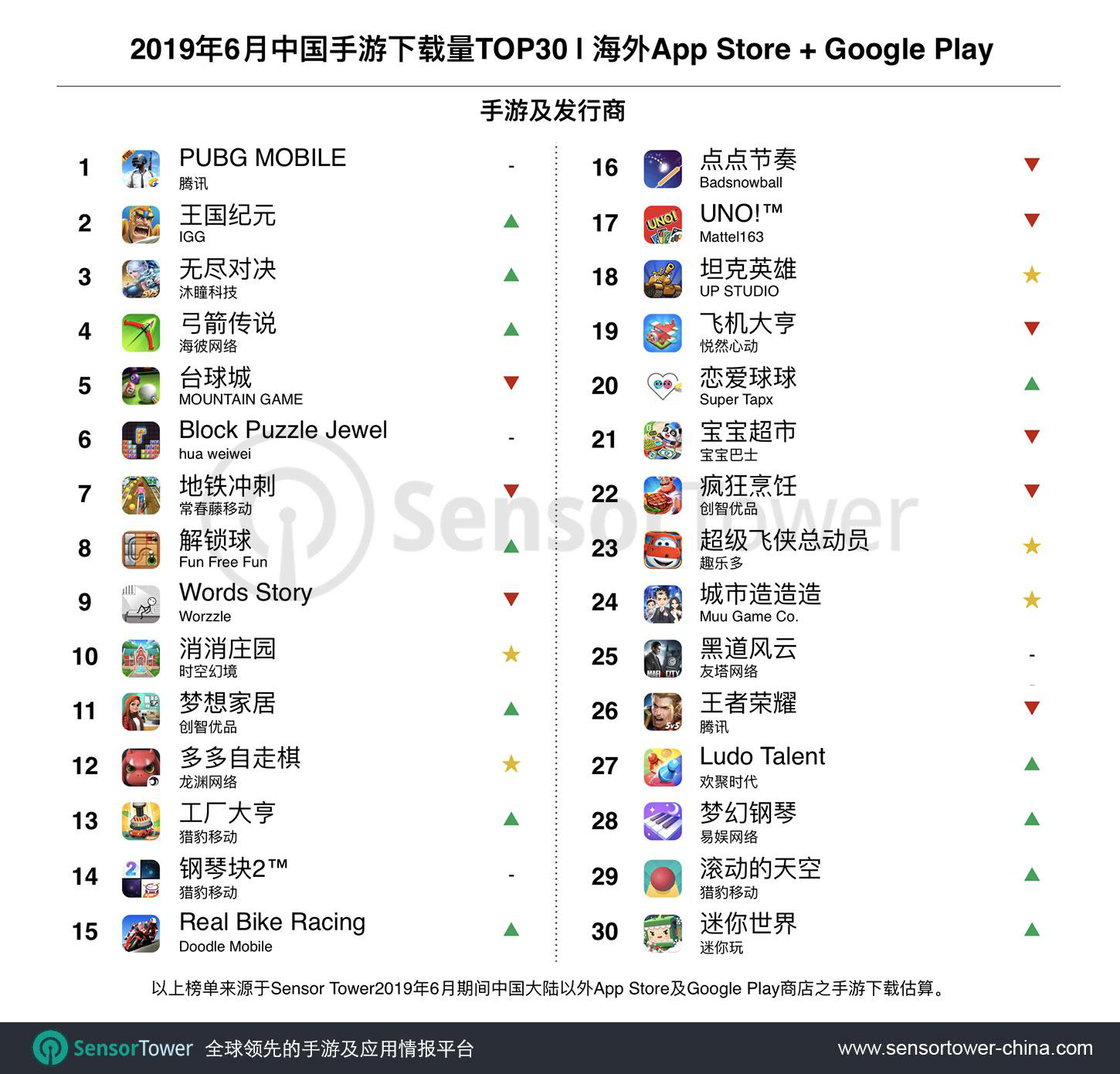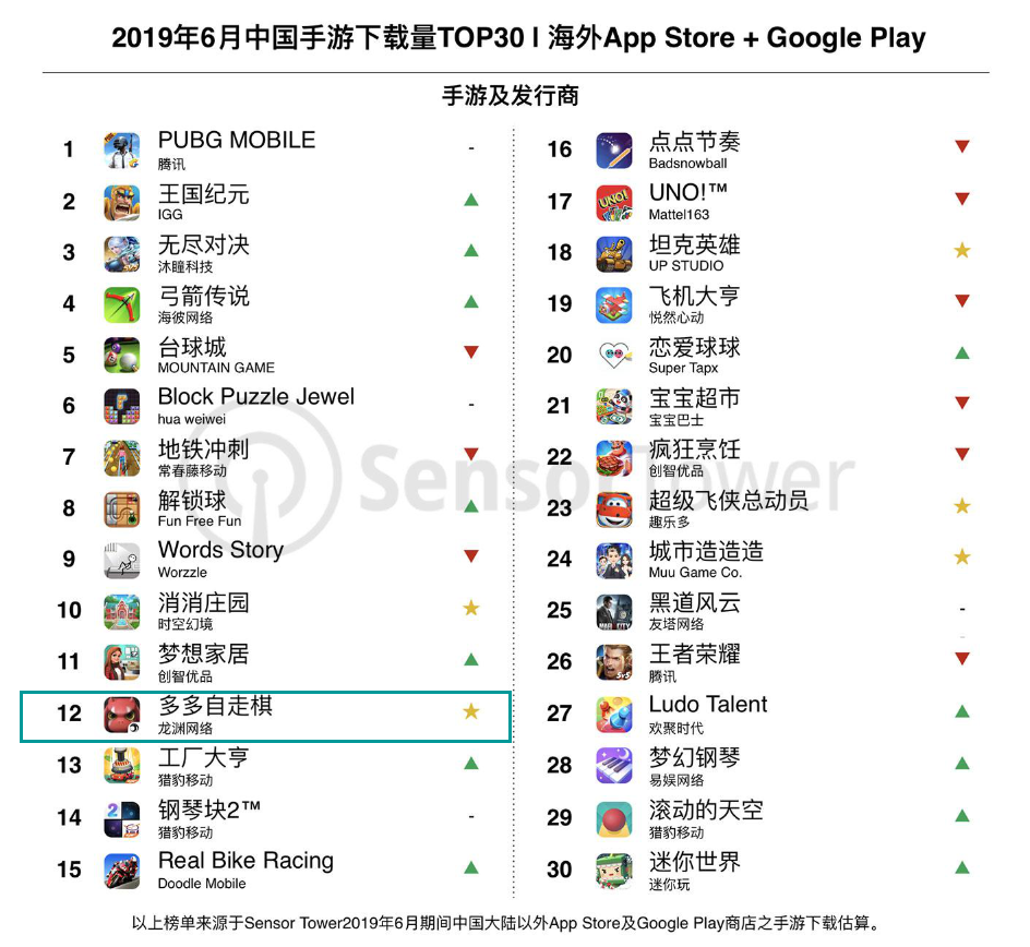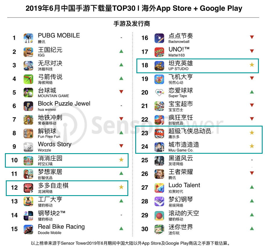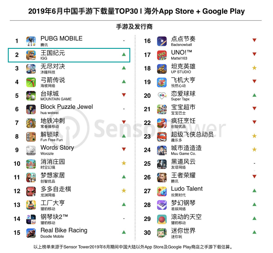 今天(7月24日),数据分析公司SensorTower发布了2019年6月中国游戏出海报告,报告揭示了6月中国手游在海外的下载量TOP30。
