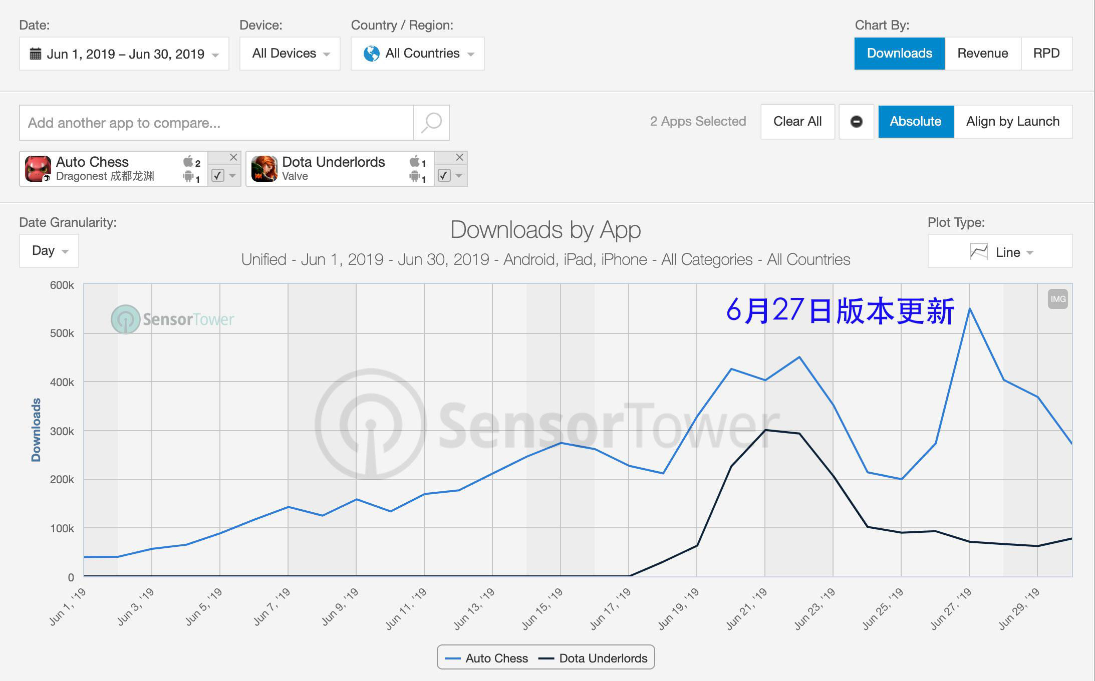 《多多自走棋》和《刀塔霸业》的6月全球下载量对比