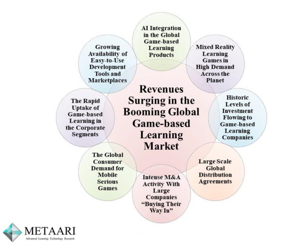 Metaari表示,带动教育游戏增长的主要动力为:AI在教育游戏里的使用、简易研发工具的增长、教育游戏越来越受到企业欢迎、全球消费者对于严肃游戏的消费需求增长、大公司频繁的并购注资、大规模全球分销协议的出现、投资公司开始向教育游戏倾斜以及混合现实(MR)在全球的需求。