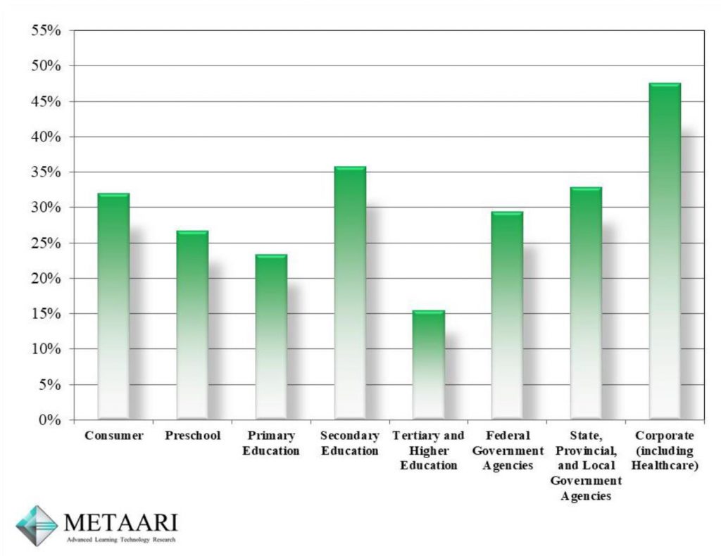 对于教育游戏的购买者,Metaari进行了详细的划分,其中最重要的包括消费者、学前教育、初级教育、中等教育、高等教育、联邦政府机构、州/省和本地政府机构和包括健康领域在内的企业。