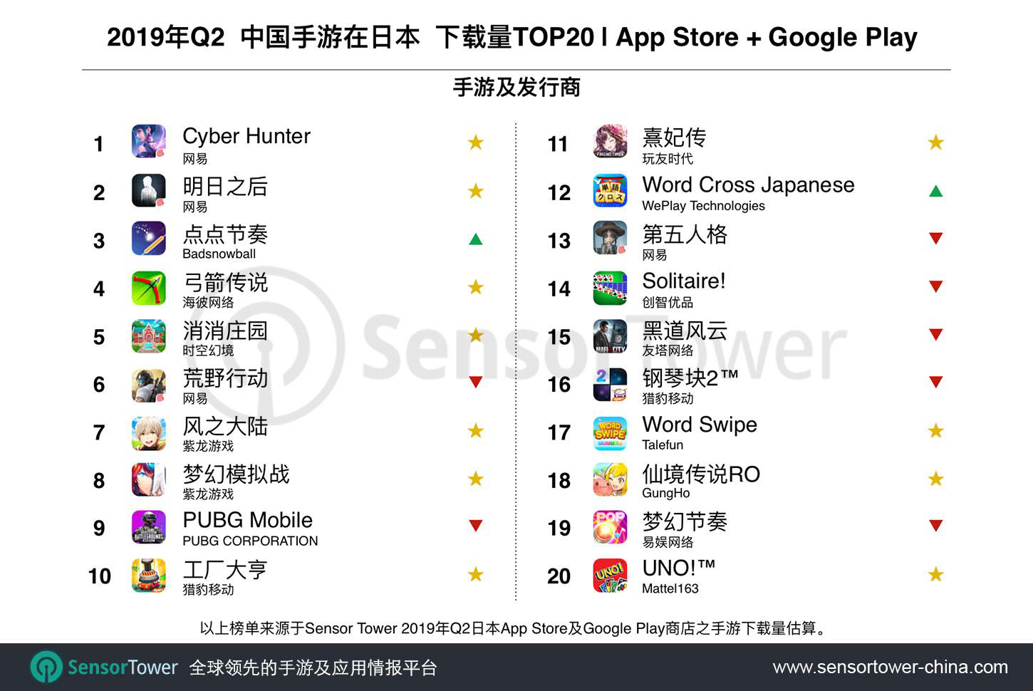 不同于较为固化的收入榜,Q2出海日本下载榜的变化非常大,新品多达11款,品类涵盖了竞技、音乐、休闲、填字类等等。除了《点点节奏》,TOP5的其余产品均为新上榜游戏,网易的《Cyber Hunter》和《明日之后》分列一二名。