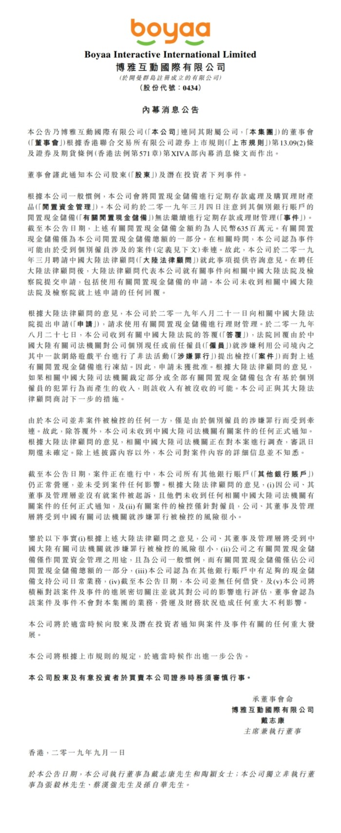 博雅互动公司认为事件可能由于受到个别雇员涉及的案件牵连。2019年8月27日,法院回复博雅互动称,由于中国大陆有关司法机关对公司个别现任或前任雇员就涉嫌利用公司境内的其中一款网络游戏平台进行了非法活动提出检控而对上述有关闲置现金储备进行冻结。