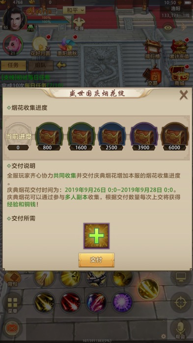 此外,在即将到来的是十一长假期间(10月1日至7日),全新活动“盛世庆典烟花绽”也将全服开启,30级以上玩家均可参与。活动期间,玩家可以通过参与各种副本获得道具“庆典烟花”,可以在洛阳NPC郭青处交付道具“庆典烟花”,可获得奖励。当全服玩家交付进度到达一定数量时,玩家将有机会获得蓝田玉令、根骨丹、涅槃丹等珍贵道具。
