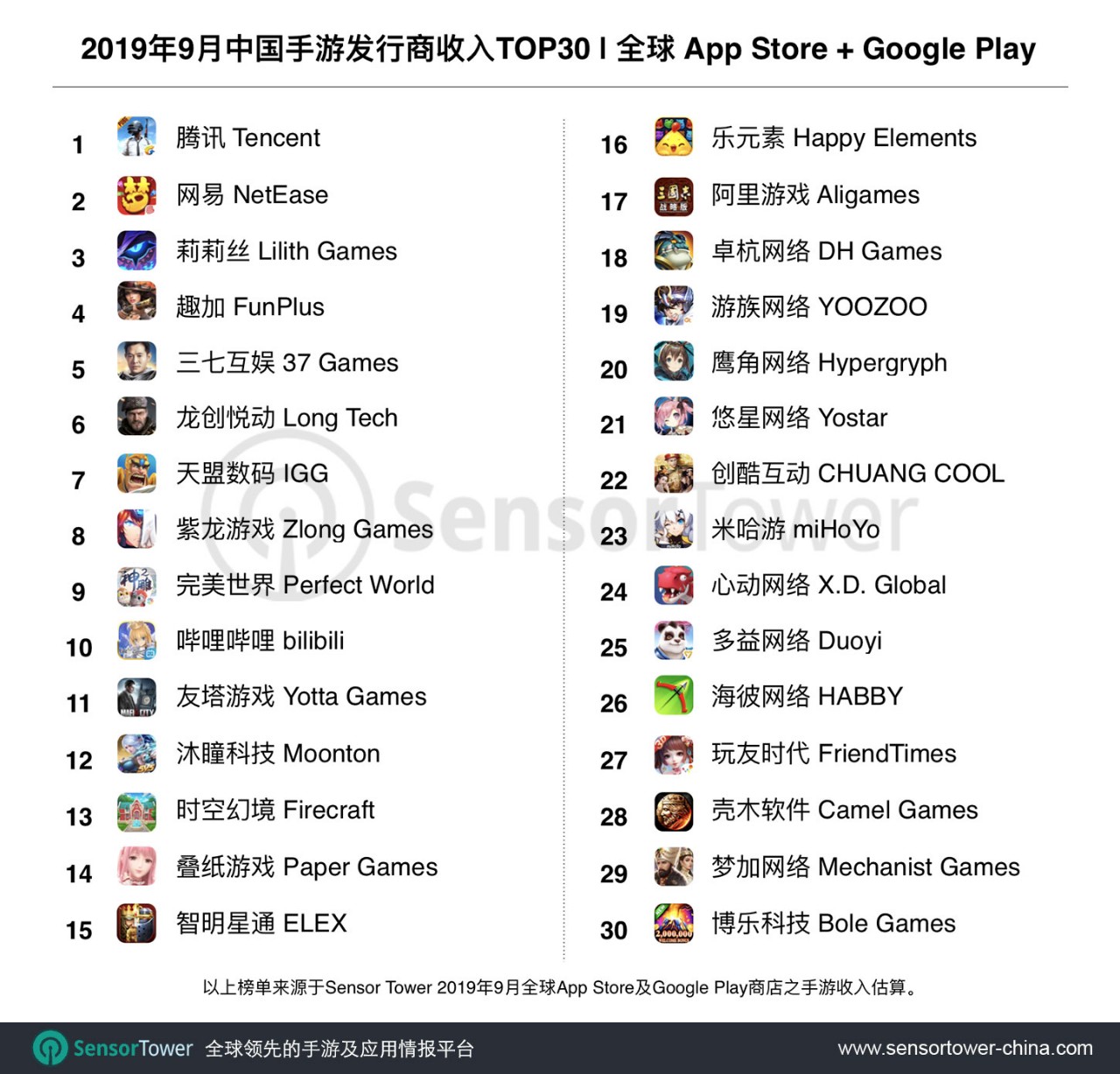 日前,Sensor Tower 发布了2019年9月中国手游发行商在全球 App Store 和 Google Play 的收入排名。榜单中30个手游发行商9月全球吸金超过14.5亿美元,拿下当期全球手游总收入27.9%的市场份额。详细榜单变化如下。